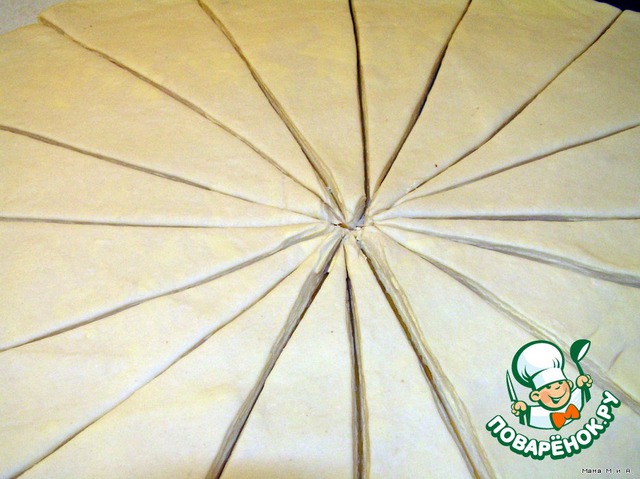 Я сильно уж не раскатывала тонко - плечо болит, поетому у меня такие "подушечные" треугольники. Вообще надо в 2 раза тоньше. |