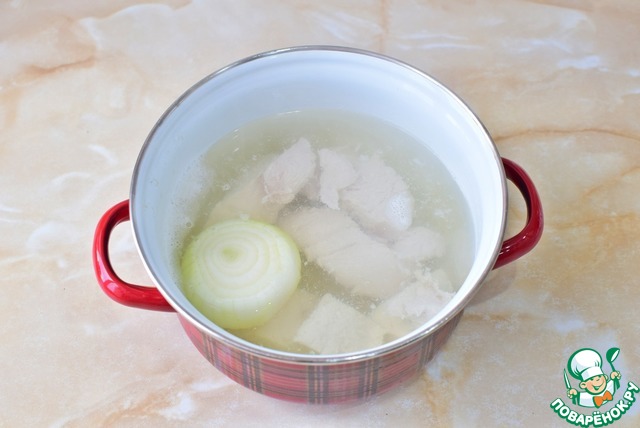Затем добавьте в кипящий бульон очищенную луковицу и немного соли. Варите мясо 15-20 минут на небольшом огне.