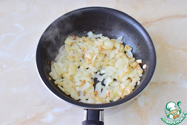 В это время очистите вторую луковицу и мелко её нарежьте. Обжарьте лук с добавлением растительного масла, чтобы он начал золотиться.