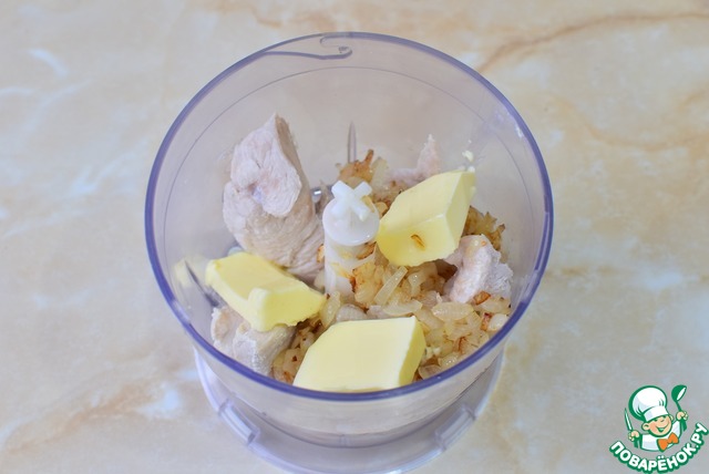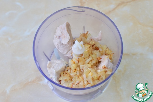 Готовое мясо выложите в измельчитель. Добавьте к нему обжаренный лук.
