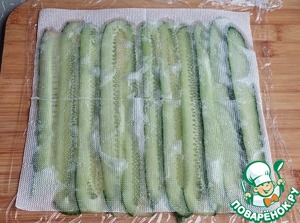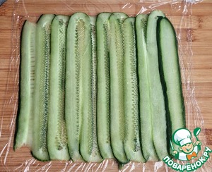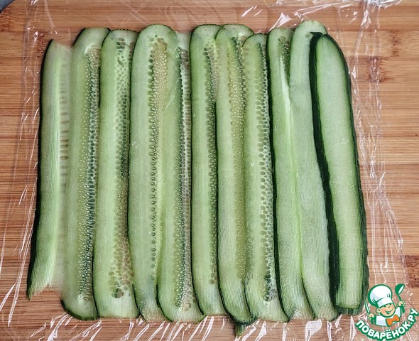 Огурец хорошо помыть, нарезать тонкими слайсами с помощью овощечистки. Разложить на пищевой пленке внахлест друг на друга.