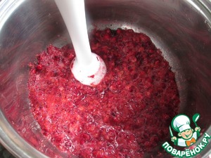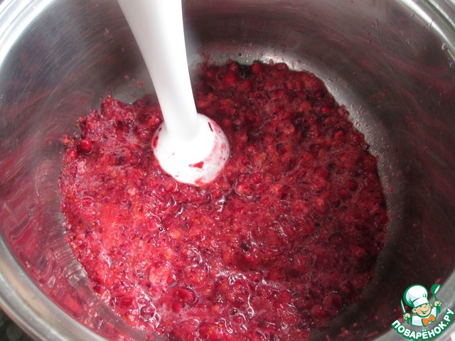 350 г клюквы вымыть, дать стечь воде и измельчить блендером. По желанию можно протереть через сито, я оставила так, в измельчённом виде.