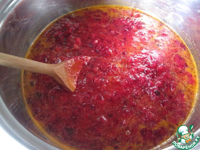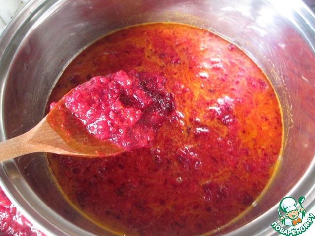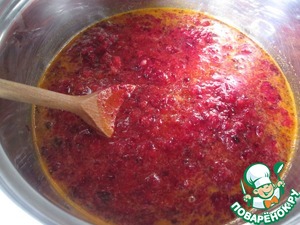 Затем ягоды вымыть, дать стечь воде и пропустить через соковыжималку. Отмерить 1.5 л сока и поместить в кастрюлю.