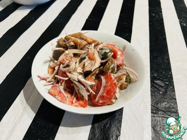 Вкусный салатик, только нужно его сразу есть а то потом пускает воду.