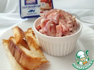 Добавляем творожный сыр и тщательно перемешиваем вилкой.