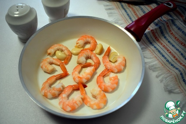 Пока варится полента, занимаемся креветками. Растопим на сковороде сливочное масло, около минуты прогреем в нем зубчики чеснока, благодаря чесноку масло получит приятный чесночный вкус и аромат, который в дальнейшем передаст креветкам. Очищенные креветки обжариваем на медленном огне около 5 минут. Присаливаем.