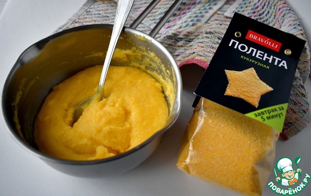 Вливаем в кастрюлю воду, добавляем по вкусу соль и даем воде закипеть. В кипящую воду, непрерывно помешивая, всыпаем тонкой непрерывной струйкой поленту. Варим поленту на слабом огне в течение 5 минут.