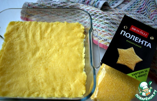 Готовую поленту выкладываем в форму и равномерно распределяем по всей площади основания. Слой поленты должен быть высотой 1-1,5 см. Даем поленте остыть.