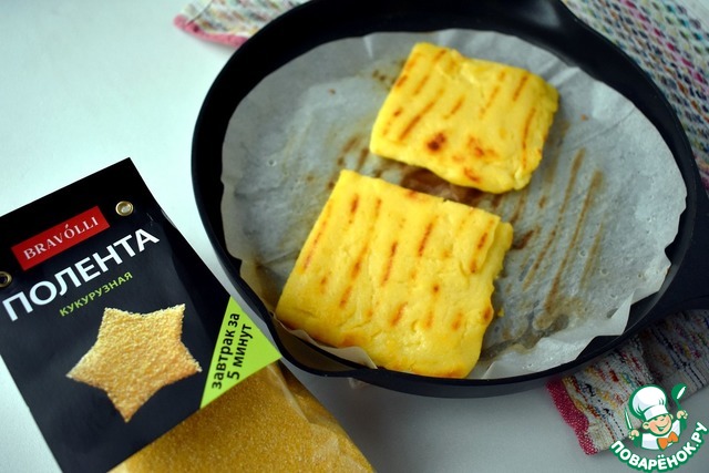 Разогреваем сковороду ( меня сковорода - гриль) и обжариваем на среднем огне куски поленты до золотистого цвета и хрустящей корочки. Снимаем поленту со сковороды, выкладываем на бумажную салфетку для удаления лишнего масла, даем остыть и нарезаем поленту небольшими кубиками.