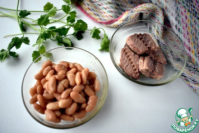 С консервированного тунца сливаем сок (масло). Фасоль отделяем от жидкости через ситечко.