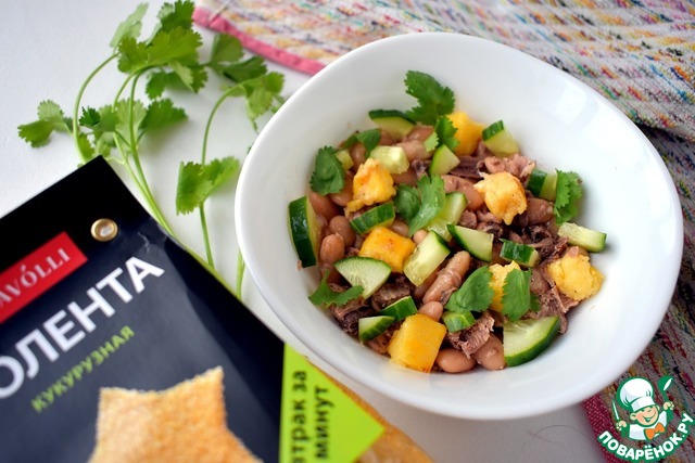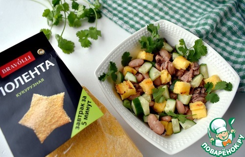 Салат с тунцом и белой фасолью я готовлю часто и обычно в него добавляю сухарики, гренки или кириешки. Сегодня вместо них я добавила кубики жареной кукурузной поленты. От этого вкус салата изменился, он стал более интересным.