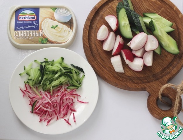 Тонкой соломкой нарежьте огурец и редис. Зелень отделите от стеблей и мелко измельчите.