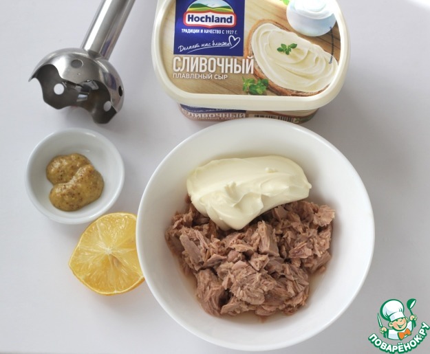 Выложите в чашку консервированную рыбу и соедините со сливочным сыром ТМ Hochland, добавьте горчицу, лимонный сок, посолите по вкусу, приправьте свежемолотым перцем и пробейте блендером.