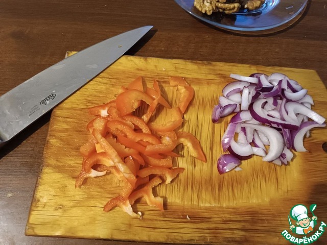 Овощи солим и перчим по вкусу и желанию, добавляем наш "орехово -яблочный" соус и уже с овощами ещё раз перемешиваем. -