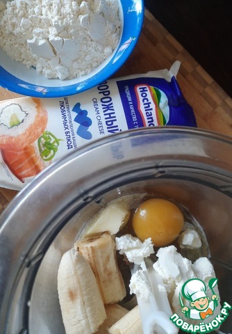 В процессор закладываем мягкое сливочное масло, яйцо, творожный сыр ТМ Hochland, банан.