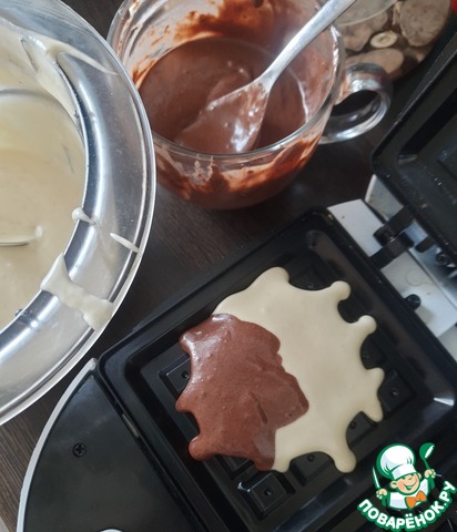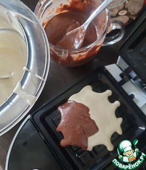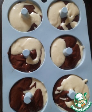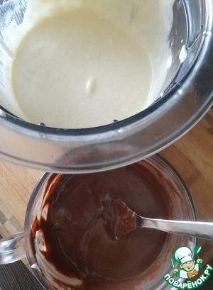 В одну добавляем какао и остатки молока. И тщательно перемешиваем. -