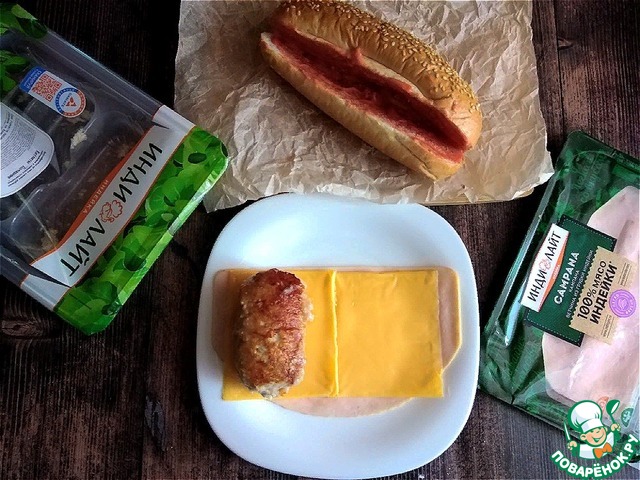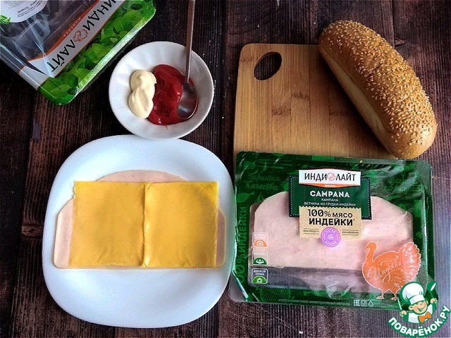 Пока жарятся котлеты, готовим всё для "хот-догов". Кетчуп соединяем с майонезом. Ломтики ветчины CAMPANA ТМ ИНДИЛАЙТ из мяса индейки (в упаковке 4 ломтика) выкладываем на тарелку. Поверх каждого ломтика - 2 пластины сыра плавленного для бургеров. Как раз на ломтик ветчины помещается 2 пластины сыра.