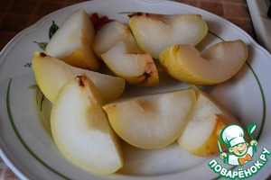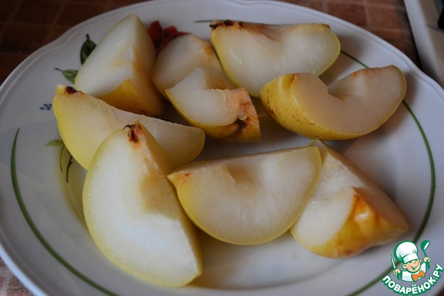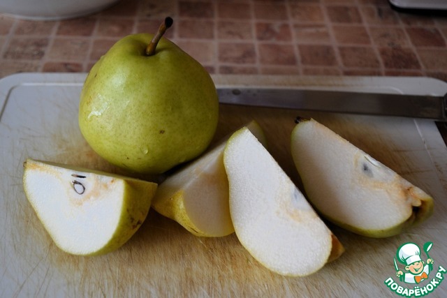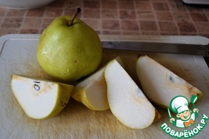 Грушу разрезать на 4 части. Жёсткую сердцевину удалить.