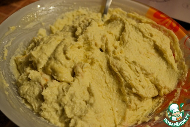 Вмешать получившуюся смесь в творог, добавив натёртую на тёрке свежую апельсиновую цедру. Убрать творожное тесто в холодильник минимум на час. Я оставляла на ночь.