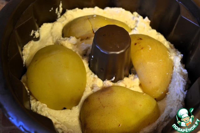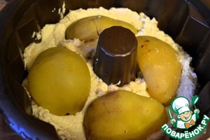 В форму для выпечки выложить половину творожной массы. Сверху выложить остывшие груши.