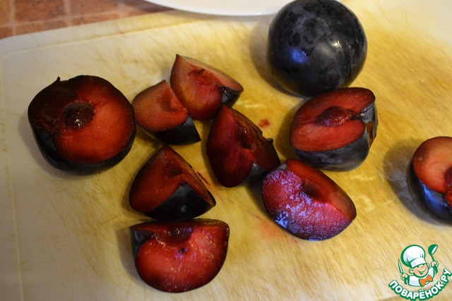 Сливы разрезать пополам, косточку удалить. Разрезать половинки слив на 2 части.