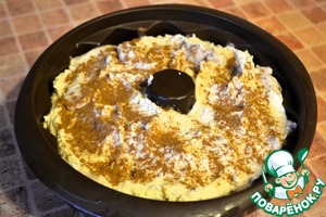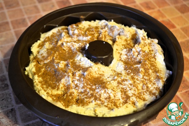 Закрыть выложенные фрукты оставшейся творожной массой. Сверху запеканку посыпать молотой корицей.