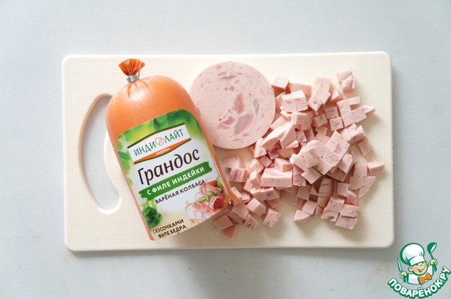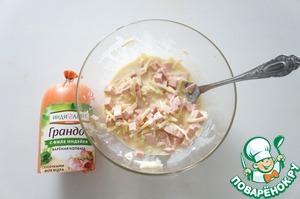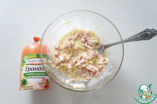 В миске смешиваем яйцо, йогурт без добавок, тёртый сыр, добавляем колбасу. Соль и перец по вкусу.