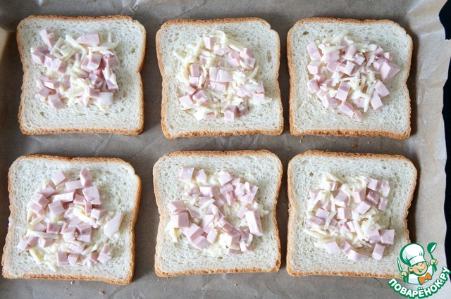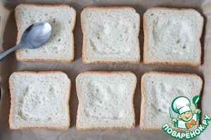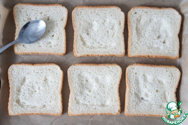 Тостовый хлеб хорошо проминаем ложкой в серединке, формируя углубление.