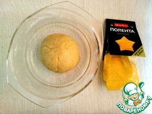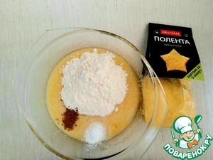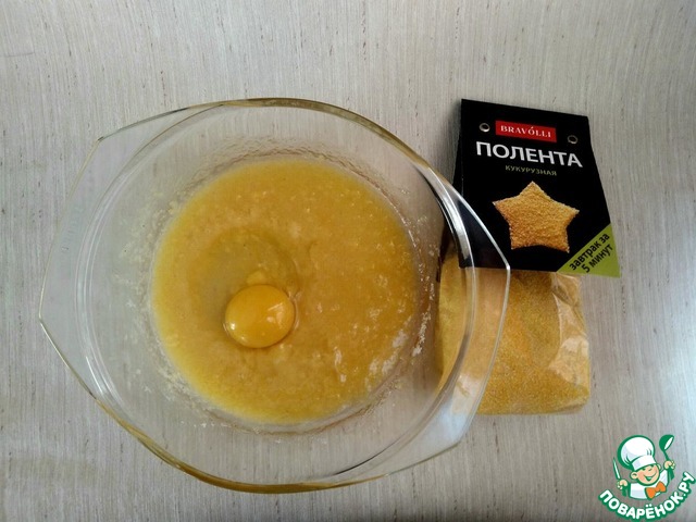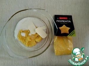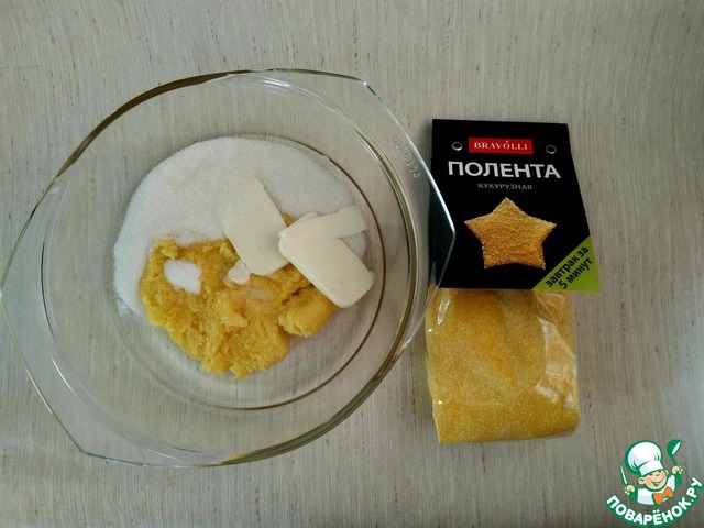 Сварите кашу из поленты на воде, выложите в ёмкость для смешивания. Затем добавьте сливочное масло, соль и сахар, тщательно перемешайте.