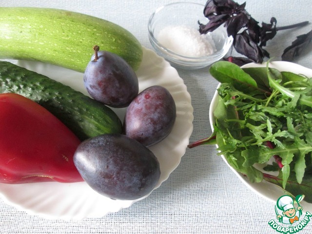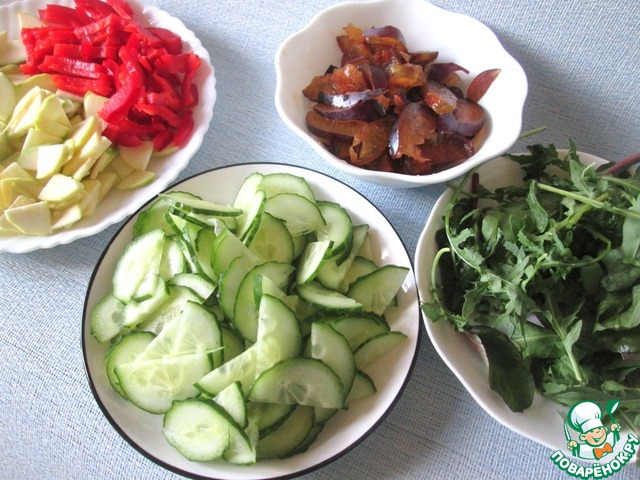 Болгарский перец без семян нарезать соломкой. Сливы нарезать полосками. Салатные листья вымыть, обсушить и нарвать руками (вместо кресс -салата здесь микс : руккола и мангольд) -