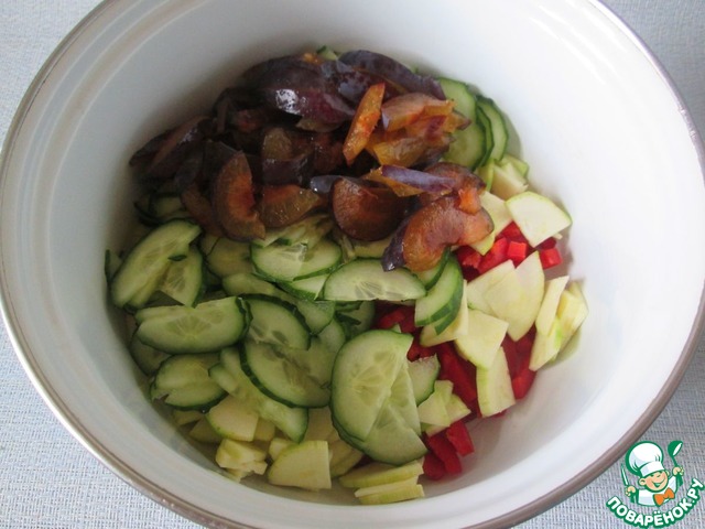 Рецепт взят из электронной кулинарной книги, и я благодарю автора- составителя за интересные варианты салатов. Этот салат больше похож на летний, но и сейчас в продаже есть молодые кабачки и остальные овощи.