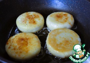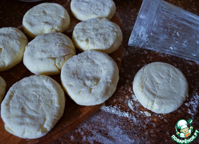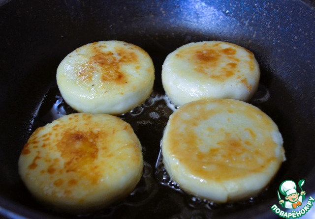 Стряхнуть лишнюю муку, жарить сырники, на огне чуть выше среднего, по 1 минуте с каждой стороны, так сказать "запечатать". Затем ещё по 1-2 минутки, на меньшем огне.