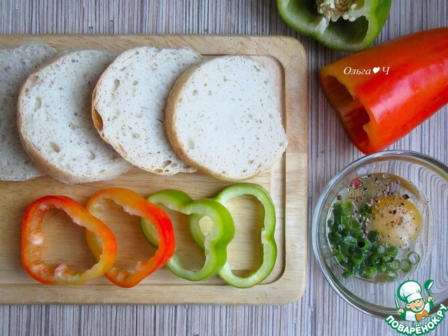 Булочки нарежьте ломтиками. Перец разных цветов нарежьте кружочками, толщиной 0,6-0,8 см. Яйцо смешайте с солью, смесью перцев и нарезанным зеленым луком.