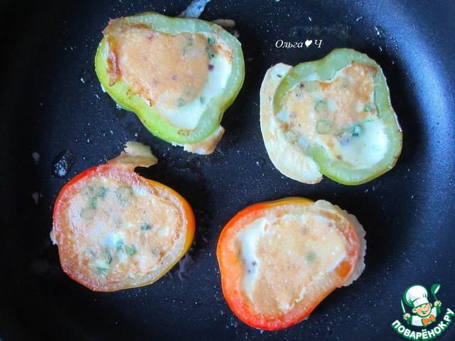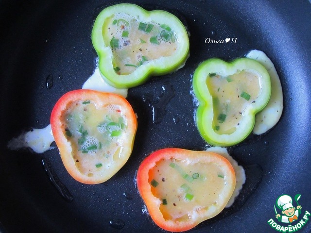 Разогрейте растительное масло в сковороде, выложите кружочки перцев. Аккуратно залейте в перцы по 1 ст. л. яичной массы, затем поровну разлейте оставшуюся массу. Накройте крышкой, готовьте на огне ниже среднего 2-3 минуты.