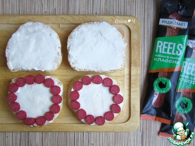 Булочки намажьте плавленым сыром. Колбаски нарежьте тонкими кружочками и выложите по внешнему контуру булочки.