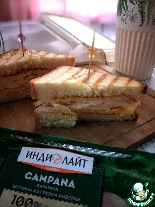 Я буду обжаривать сэндвич на сковороде-гриль, смазав её "рёбра" маслом. Обжариваем до красивых полосочек с обеих сторон.