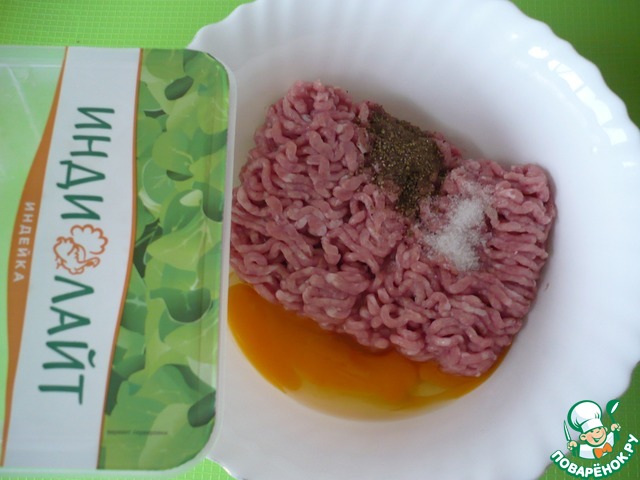 Для приготовления закуски я использовала фарш из индейки ТМ "Индилайт". В миске смешайте фарш, яйцо куриное, соль и перец по вкусу.