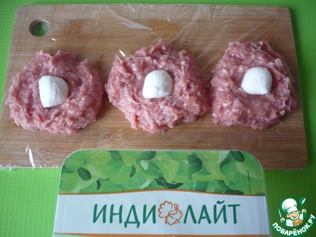 Сформируйте из смеси плоский диск, затем положите в середину мини-шарик из моцареллы.