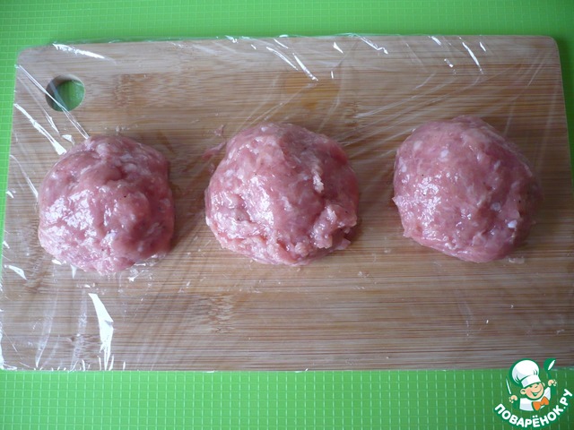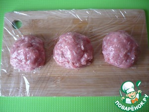 Заверните его в фарш, чтобы получился шарик. Повторяйте, пока не используете весь фарш. У меня получилось 7 фрикаделек.