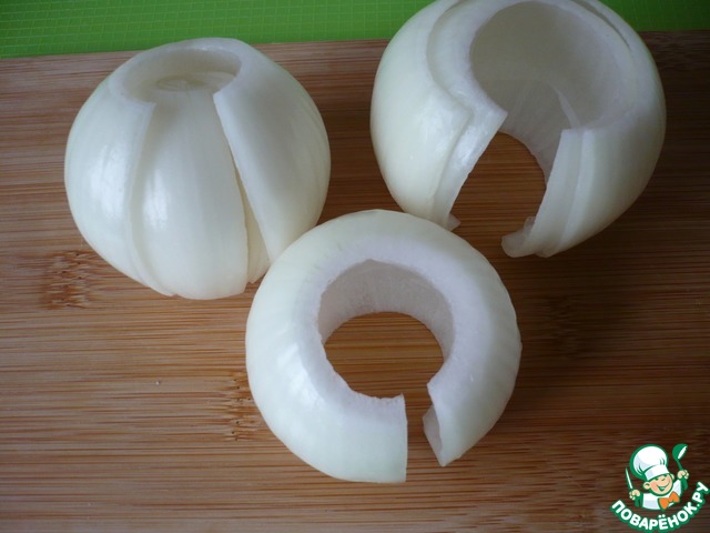 У очищенной луковицы необходимо отрезать верхнюю и нижнюю части. Затем разрежьте ее пополам, аккуратно снимите внешние слои, сохранив их целыми.