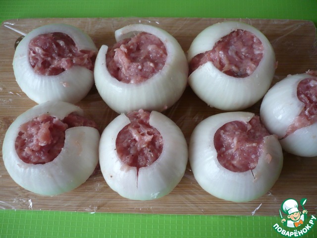 Выложите фрикадельки внутрь луковых колец.