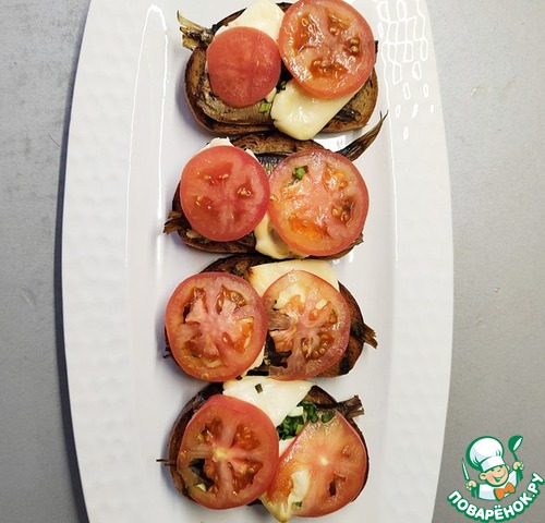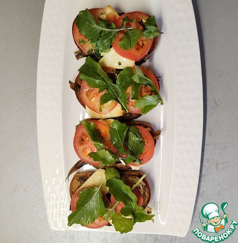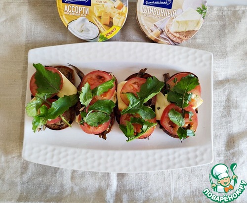 И сверху рукколу. Ну или любую салатную зелень Но с рукколой лучше. Ну и все. Быстрый вкусный перекус готов.