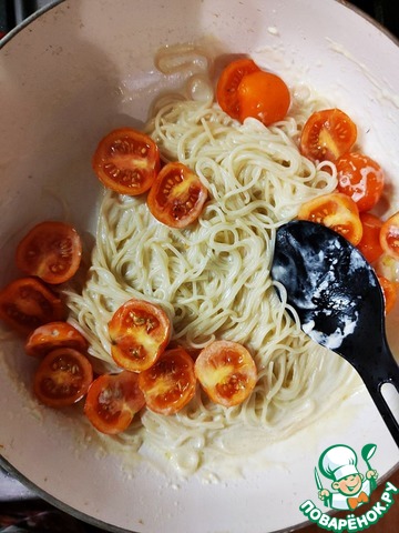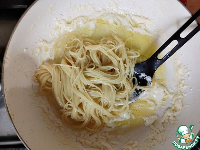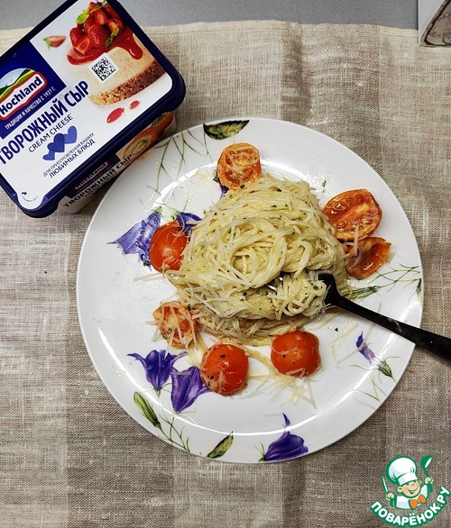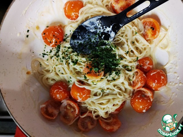 И в конце добавить мелкопорезанную петрушку. Все. Паста готова! С творожным сыром получается очень вкусно!