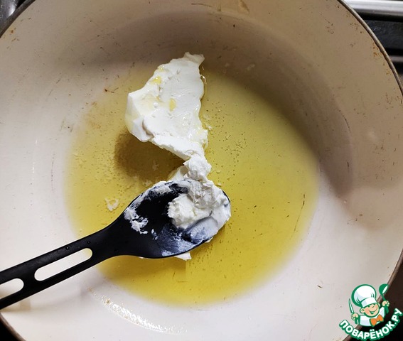 Когда масло заберет запах чеснока, зубчик убрать и добавить сливочный сыр.