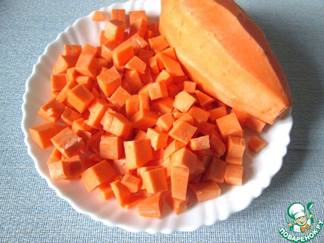 Батат очистить и нарезать кубиком.