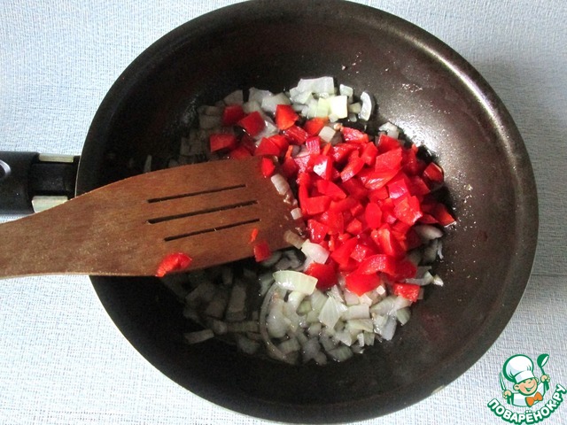 В ту же сковороду добавить нарезанный лук и нарезанный болгарский перец.