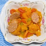 Добавить батат. Через 5 минут добавить поджаренную колбасу. Затем по вкусу - соль, чёрный молотый перец и кайенский перец (сейчас без него). Хорошо перемешать и через 1-2 минуты снять с огня.