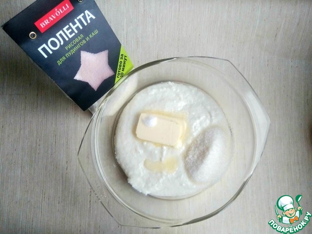 Сварите поленту в молоке около 8 минут, выложите в чашу для смешивания, добавьте сливочное масло, сахар, щепотку соли и ванилин.
