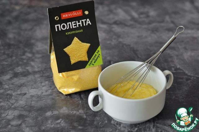 Для этого всыпьте поленту в мисочку и вливайте кипяток, постоянно и интенсивно работая венчиком. После чего остудите заваренную поленту до комнатной температуры.