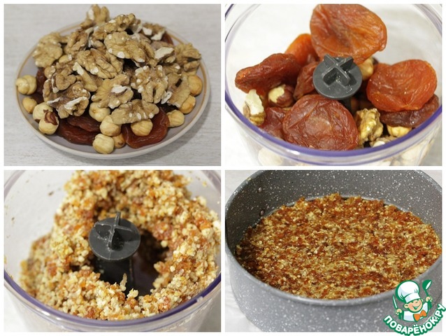 В чашу блендера сложить орехи и курагу, измельчить до однородной массы. Курага должна быть мягкая. Если она у вас подсохшая, то необходимо заранее замочить её.